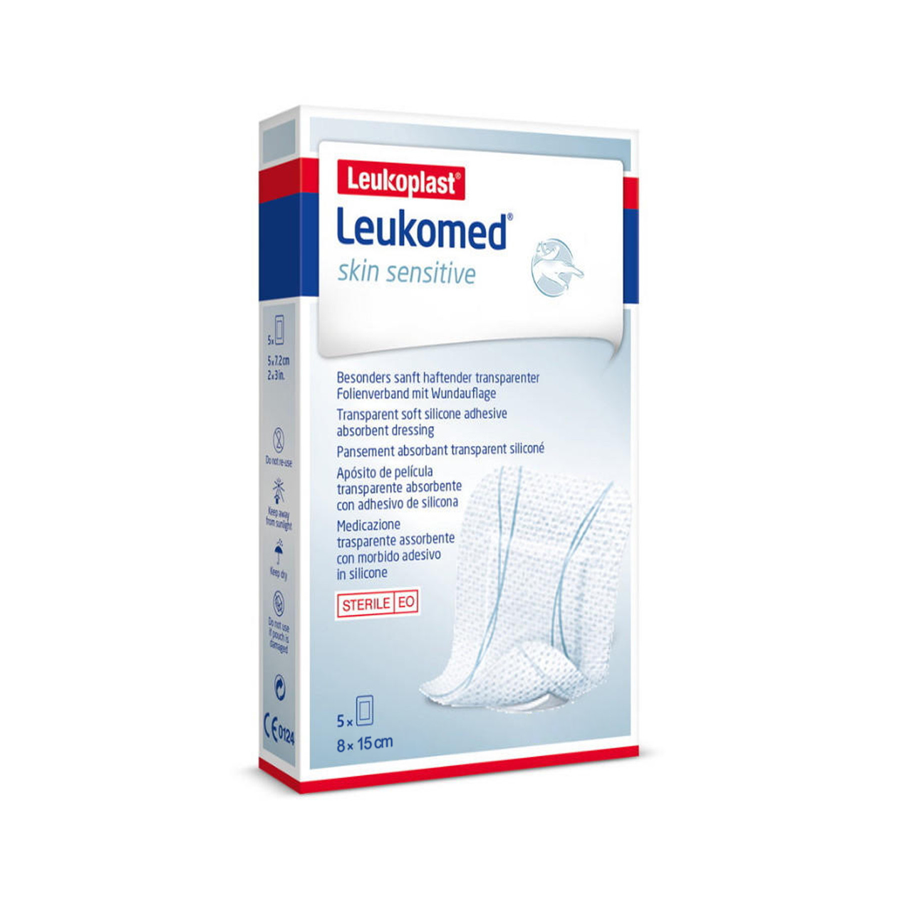 Leukoplast Leukomed Skin Sensitive is a sterile, skin-friendly absorbent dressing designed to cover and protect wounds, including closed surgical wounds, cuts, and abrasions. This 5-pack of 8 x 15 cm dressings provides gentle protection, making it ideal for sensitive skin while promoting safe and effective wound care.
